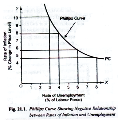 Central to macroeconomic thinking at the time was a concept called the Phillips Curve (PC). There is a subtle, but important, distinction to make here between the PC as a statistical correlation and the PC as a theory of that statistical relationship. In 1958, Phillips noticed an interesting pattern in the data: nominal wage growth seemed negatively correlated with the unemployment rate in the U.K. over the period 1913-48 (see diagram to the right). How to interpret this correlation? One theory is that when the unemployment rate is high, workers are easy to find and their bargaining position is weak, leading to small nominal wage gains. Conversely, when unemployment is low, available workers are scarce and their bargaining position is strong, leading to large nominal wage gains.Then, in 1960, Paul Samuelson and Robert Solow wrote their classic piece "Problem of Achieving and Maintaining a Stable Price-Level: Analytical Aspects of Anti-Inflation Policy." Then, as is the case still now, the authors lamented the lack of consensus on a theory of price inflation. Various cost-push and demand-pull hypotheses were reviewed, problems of identification noted, and calls for micro-data to help settle the issue were made. They also mentioned Phillips' article and noted how the same diagram for the U.S. looked like a shot-gun blast (little correlation, except for some sub-samples). Then they translated the Phillips curve using price inflation instead of wage inflation. No data was sacrificed in this exercise; their "theory" was summarized with the diagram to the left.