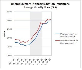 As you can see, these monthly flows are huge. And as one might expect, the UN flow rises dramatically during the recession. These are "discouraged workers;" and the phenomenon seems consistent with the deficient demand hypothesis.