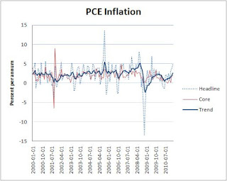 In terms of the use of core inflation, my own personal view leans toward dispensing with any inflation measure that strips out components of the consumption basket. If the main object of doing so is to get at some measure of "trend" inflation, then why not just compute a trend directly? For example, here is what one would get by using a simple exponential trend: