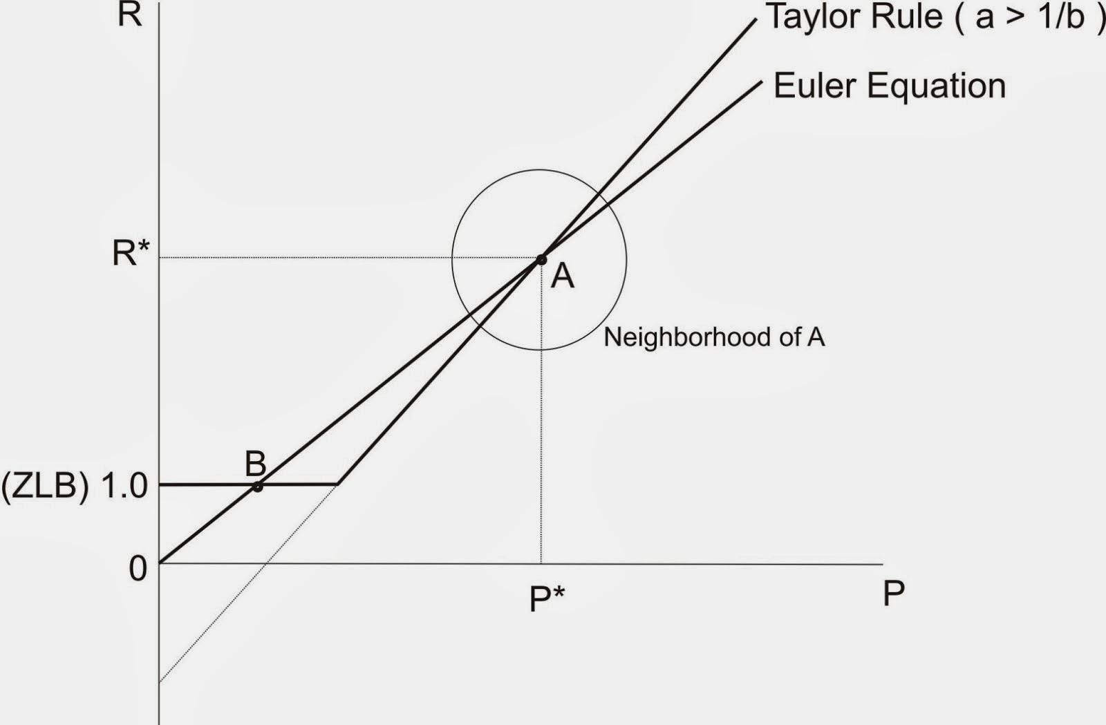The little circle in the picture above demonstrates how the New Keynesians use the "Taylor principle." Essentially, they restrict attention to trajectories around the steady state point A that never leave that circle. If the Fed follows the Taylor principle, then there is only one point that satisfies this property, and it is point A. Viola-we say that point A is "locally stable" (Yes, I know it sounds weird, but I'm just reporting the facts.) In their Perils of Taylor Rules, Benhabib, Schmitt-Grohe, and Uribe argue that only point B (the liquidity trap) is globally stable. (The fact that Japan has spent decades around a point like B suggests that it may in fact be stable.)