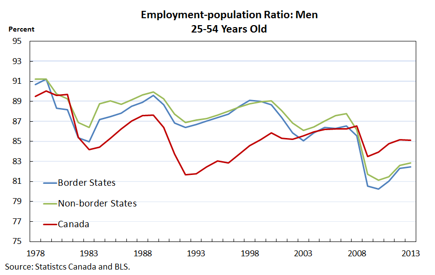 The great Canadian slump is evident in the 1990s. By the early 2000s, the employment to population ratio of prime-age males in both countries were roughly the same. The most recent recession hit the U.S. more severely than in Canada. Again, note that the border states followed their U.S. counterparts more closely than their Canadian neighbors.