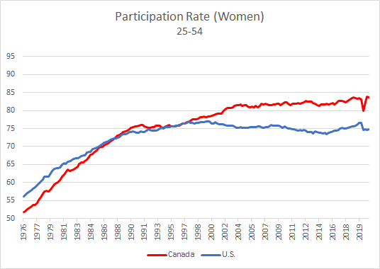 For what it's worth, I thought I'd update my labor market participate blog post from 2013 which compared participation rates across Canada and the U.S., for males and females, and across different age categories. You can find my old post here along with some links to related posts. Below I report the updated data.
